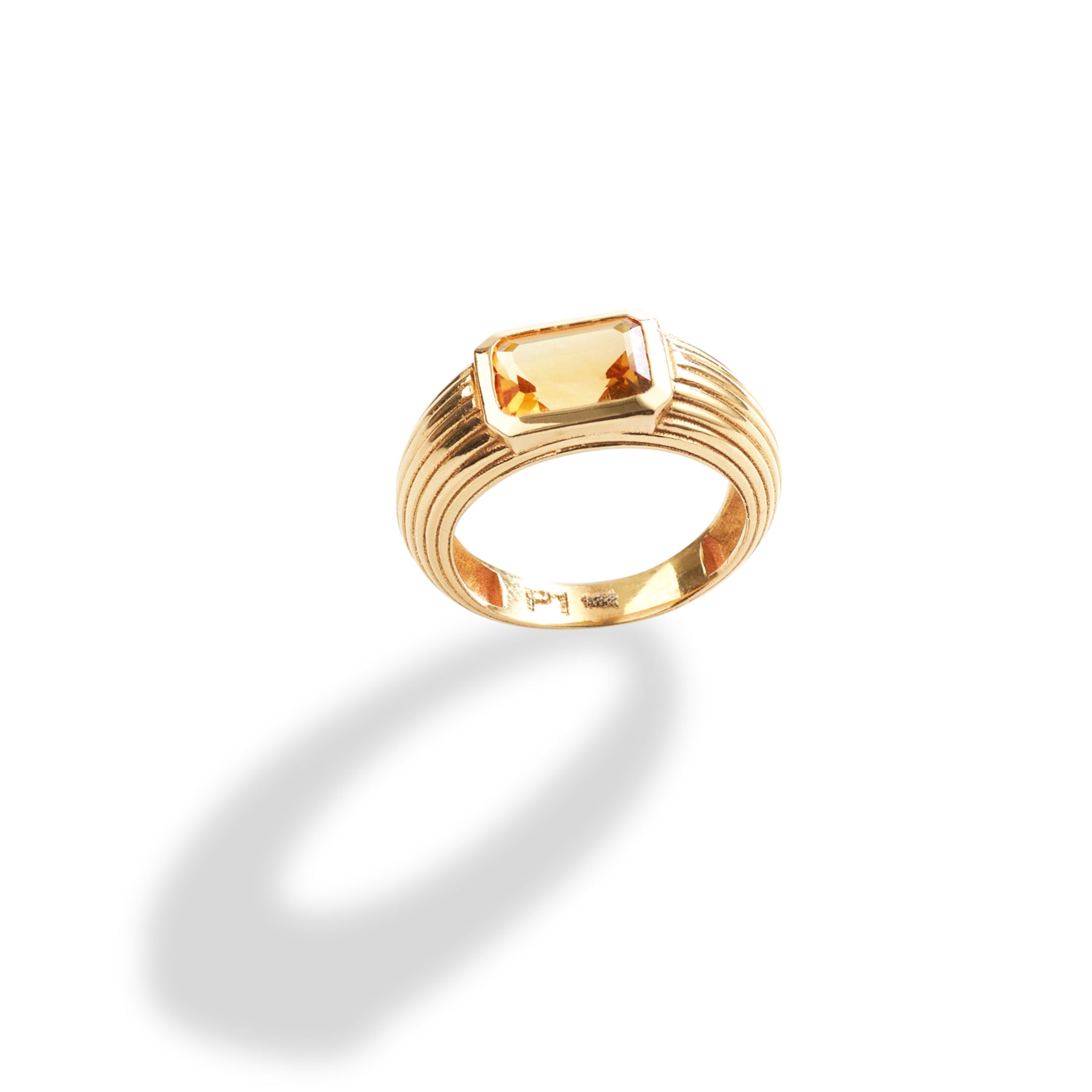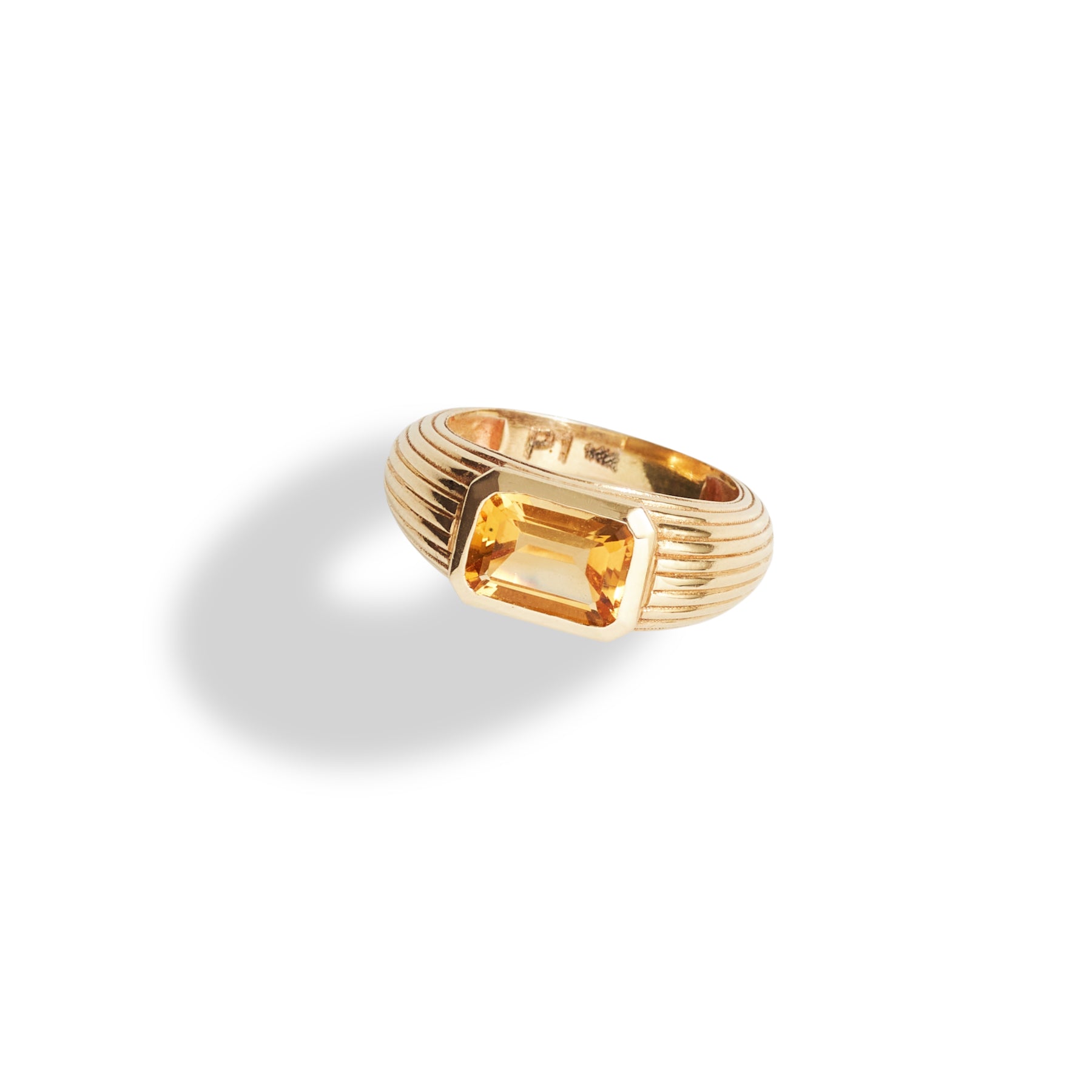 Handcrafted from 14 karat gold; Chubby Citrine Ring weighs approximately 4.5 grams and holds a stunning octagon shaped citrine stone, measuring 8x6mm.