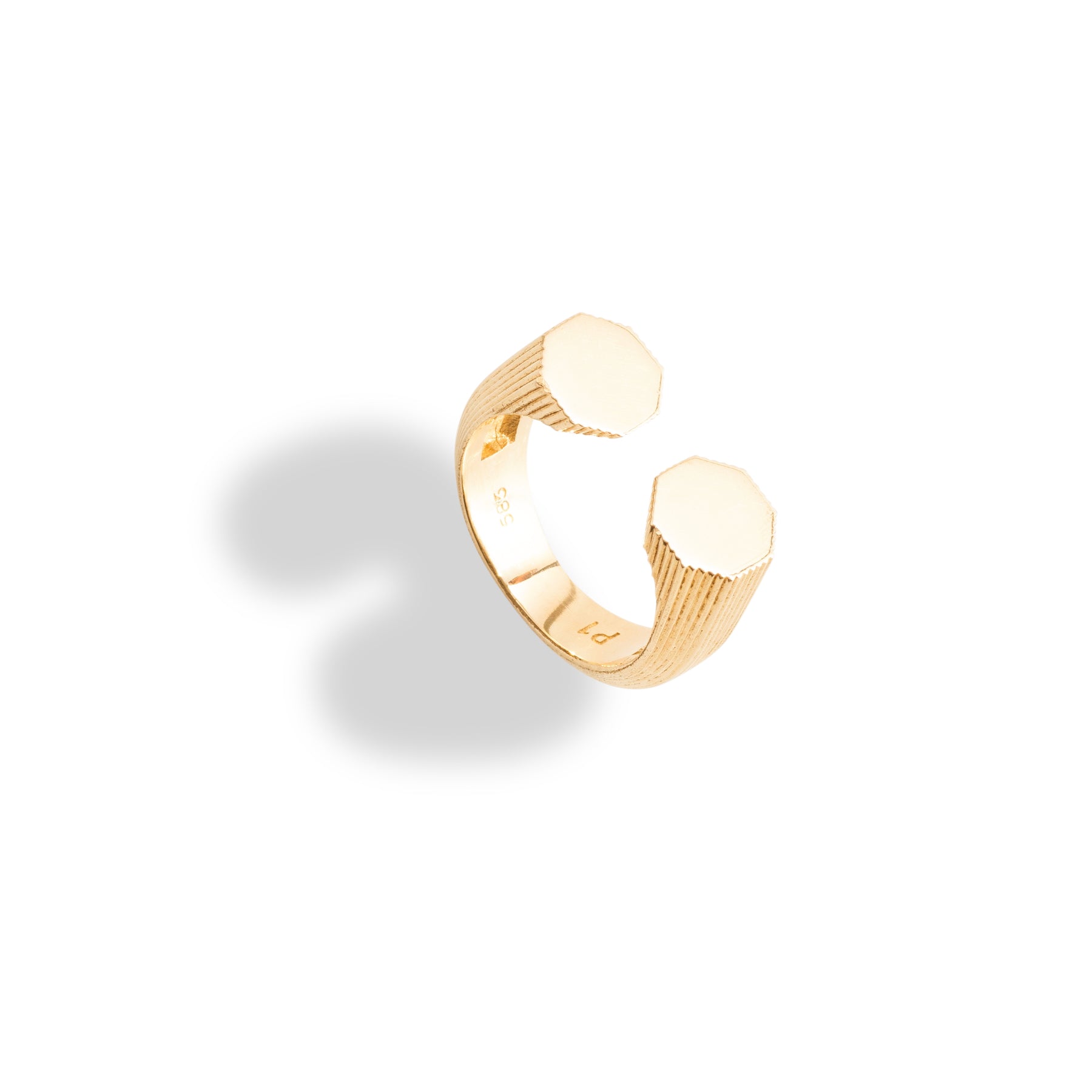 Handcrafted from 14 karat gold and influenced by Anatolian Seljuks' architectural motifs, Double Headed Seljuks Lines Ring weighs approximately 4 grams.