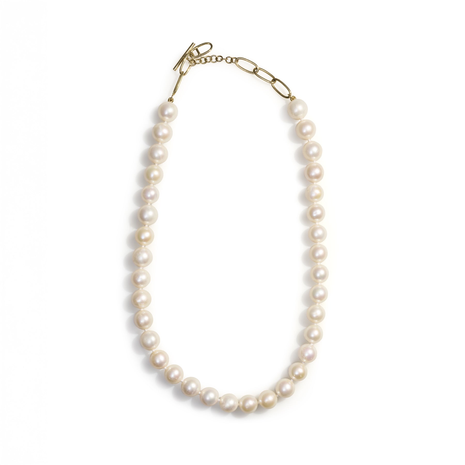 Handcrafted from 14 karat gold with thirty-three 10 mm pearls; Pearl Chain Link Necklace is a 44 cm chain link and weighs 4.5 grams.