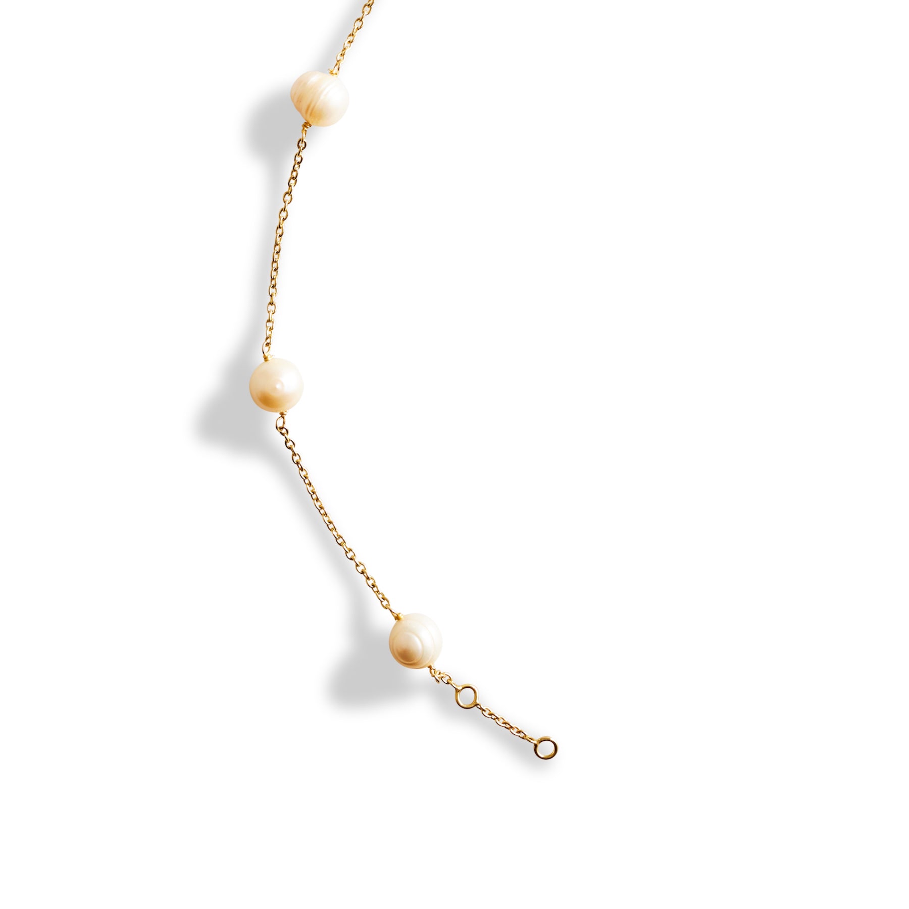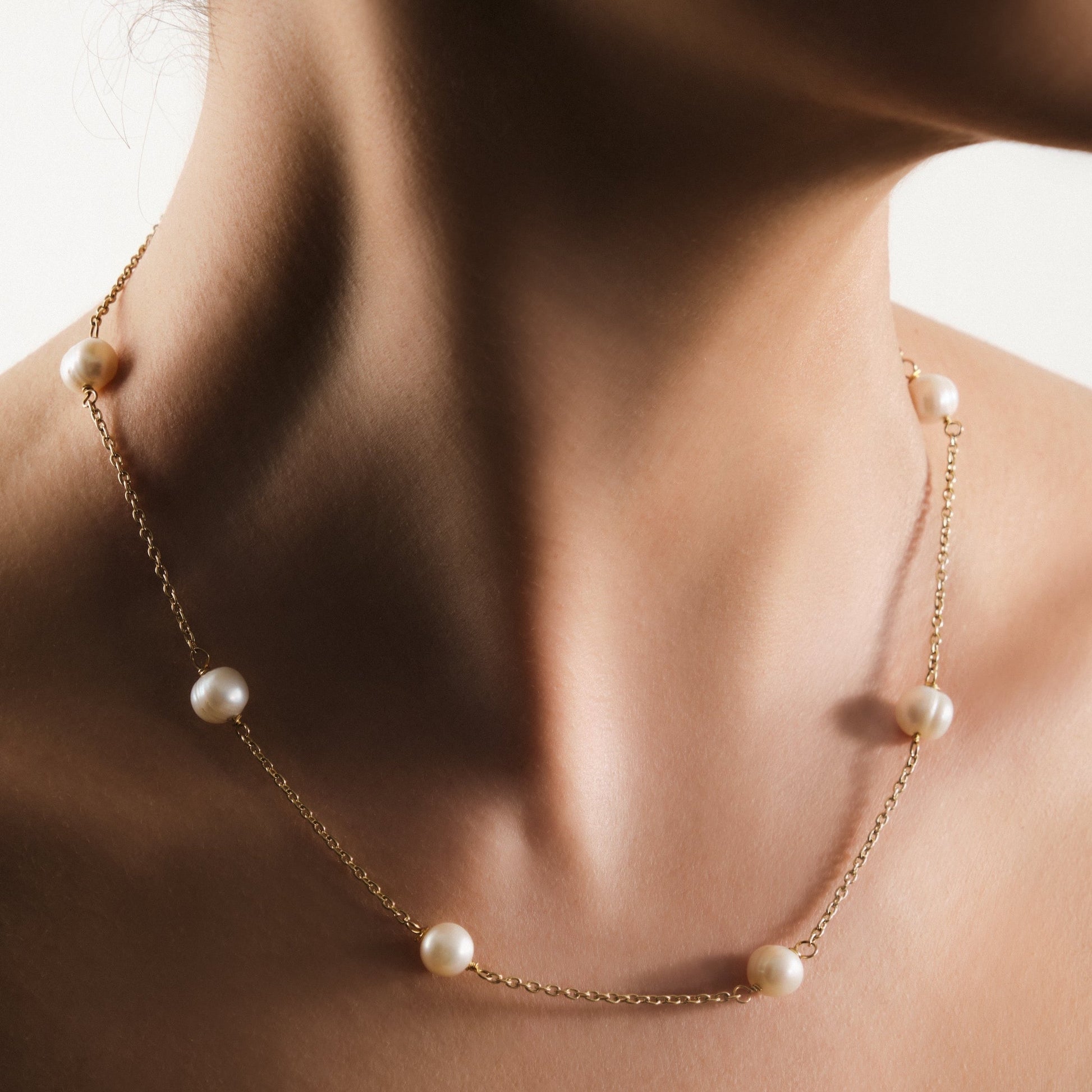 Handcrafted from 14 karat gold with eight 9.9 mm pearls; Pearl Necklace is 47 cm cable chain and weighs 5.80 grams.