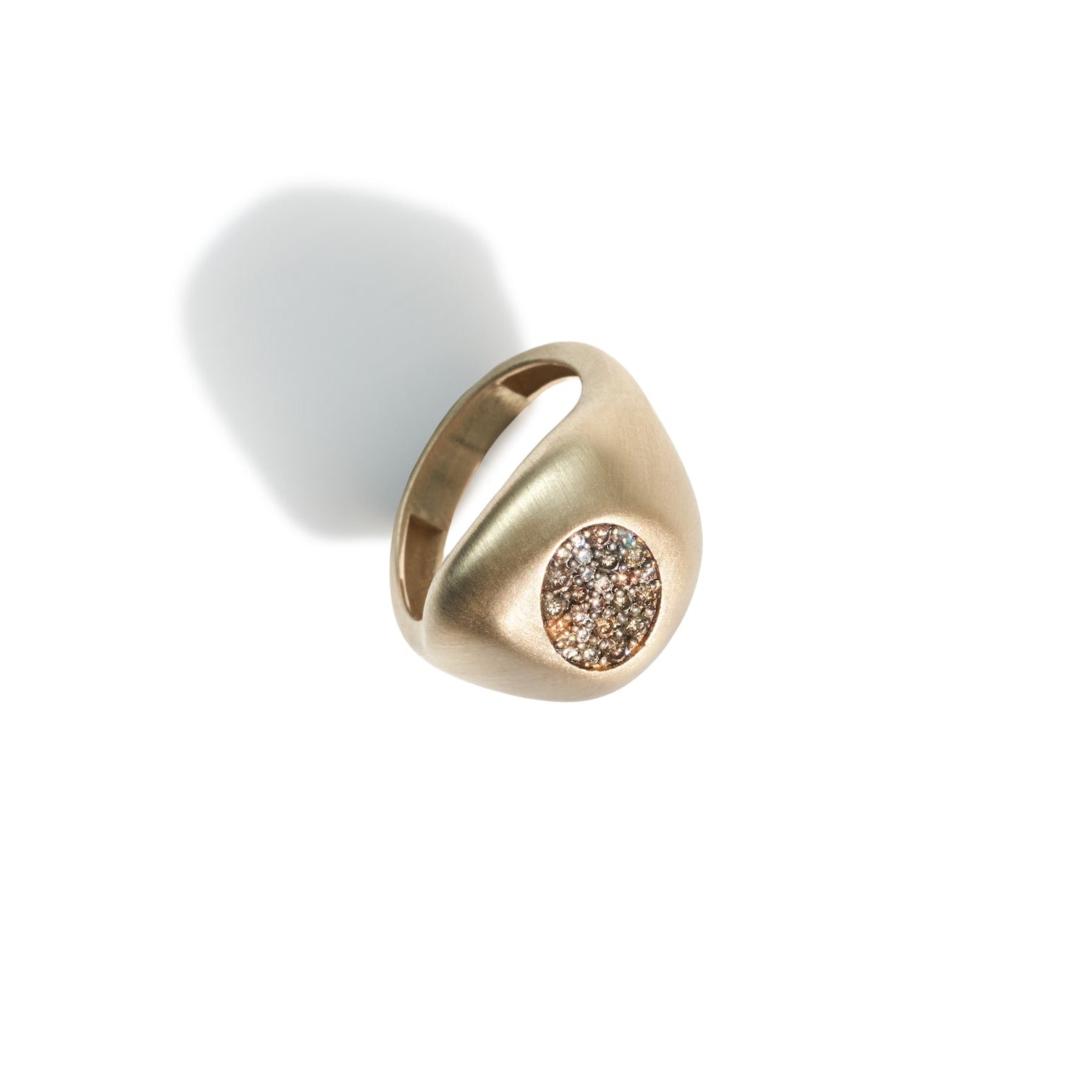 Handcrafted from 14 karat gold; Pebble Cognac Diamonds Ring weighs approximately 5.6 grams and holds sprinkles of cognac diamonds.
